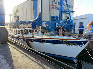 First maintenance for Reliant after 3 month sailing. On of the last mechanical parts which have not been exchanged needs to be replaced now. The shaft seal is leaky. No way to change it during the vessel stay in the water. So we go on the yard again. By the way we discover the insufficiently antifouling protection of the prop. After clean it until it looks like new again we coat it with a specially prop protection from Hempel.